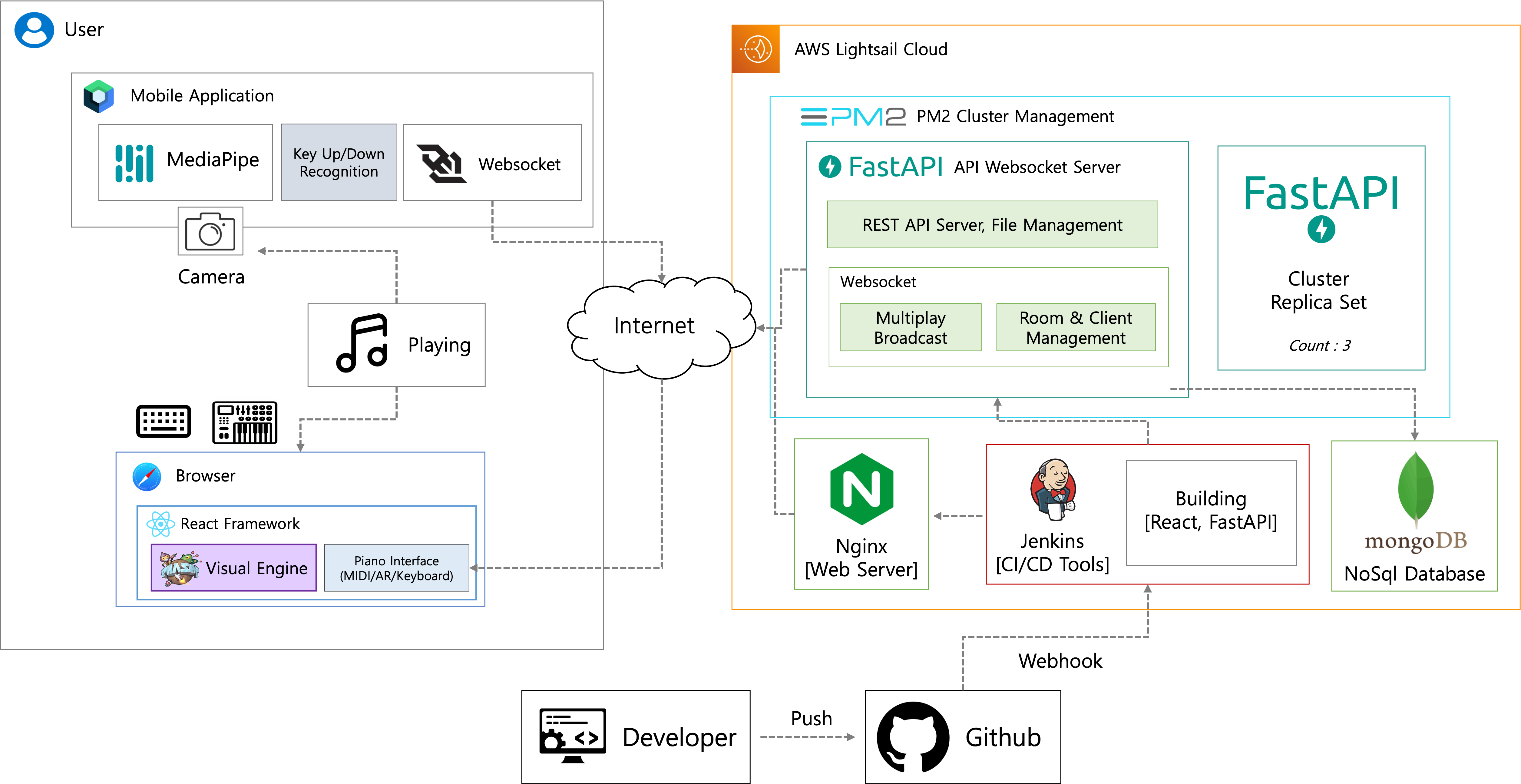 You can create a room, invite other users, play together at the same time, and play on a virtual piano using your camera through the mobile application (AR Piano)!