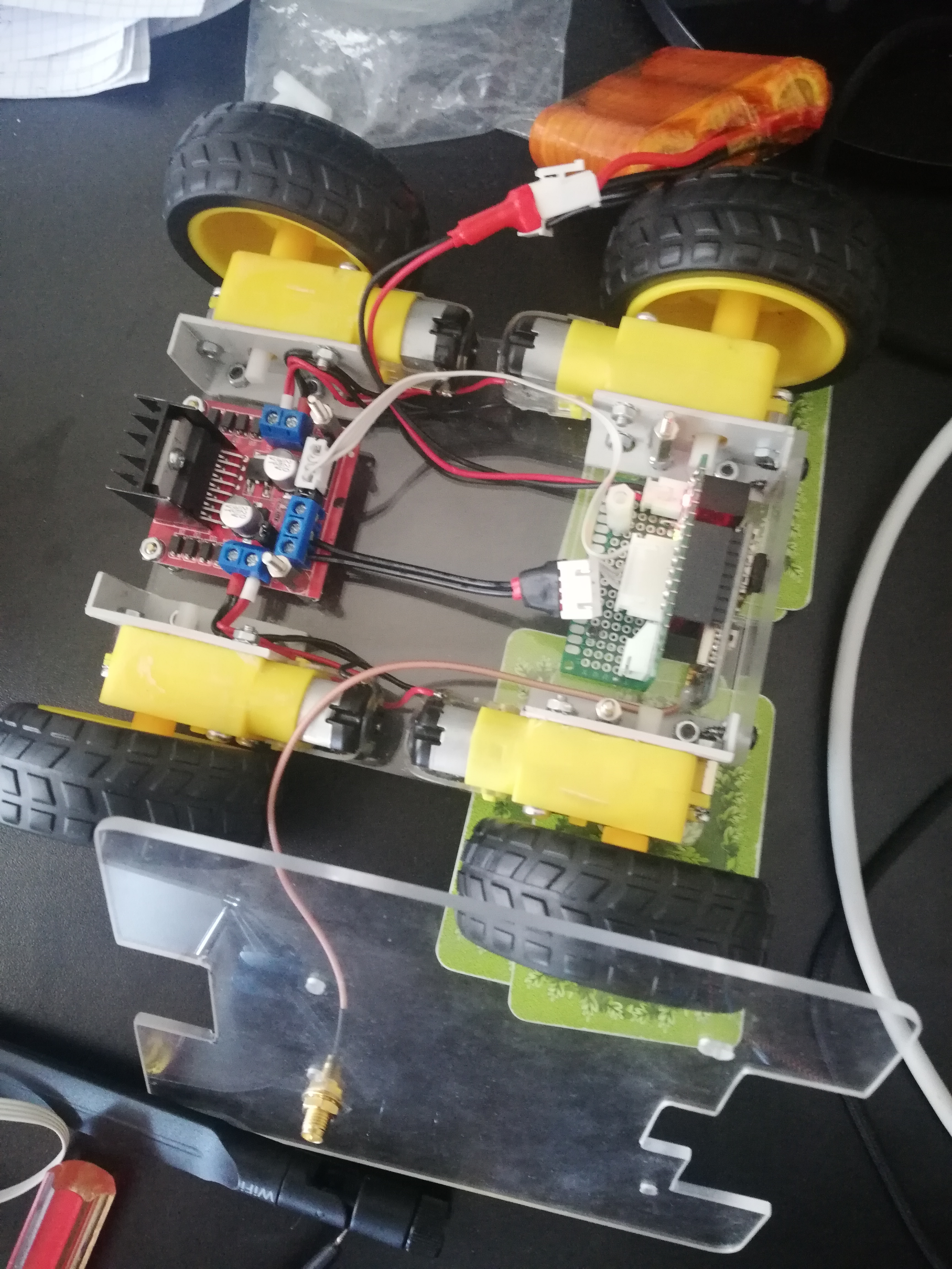 - 4 brushed motors, controlled in pairs, attached by gears to wheels.