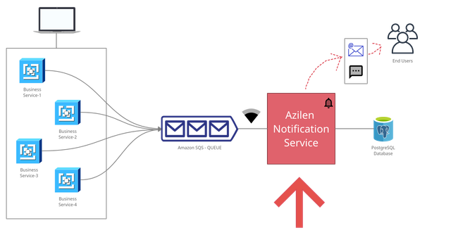 Azilen Notification Service is built on Java with JHipster Framework. The service has an Amazon SQS Listener that listens to messages receiving on SQS Queue. It does following,