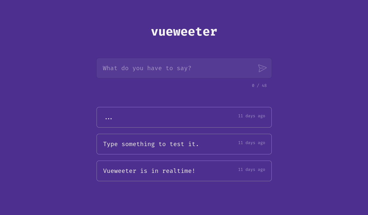 vueweeter A Simple Social Media App Created With Vue & Vuefire Try Here Screenshot NOTE: docs folder is actually the build folder but named it as docs to publish it on GitHub Pages.
