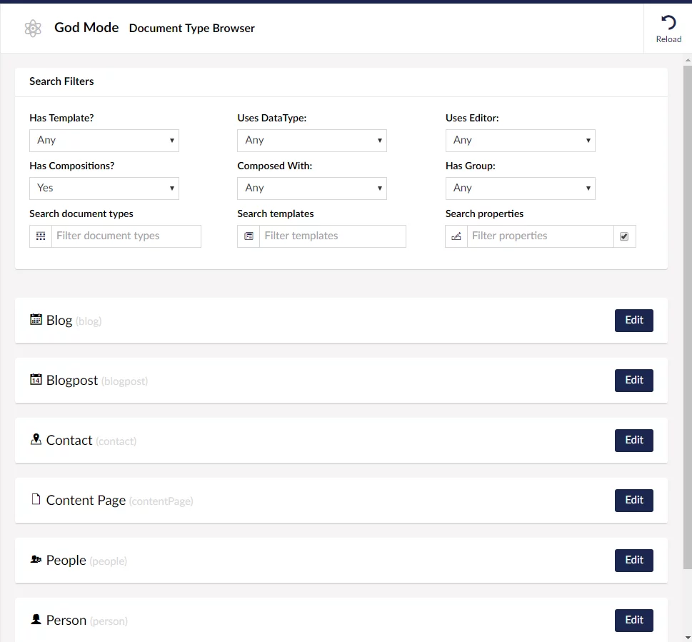 - See which document types use which property editor or data type instance