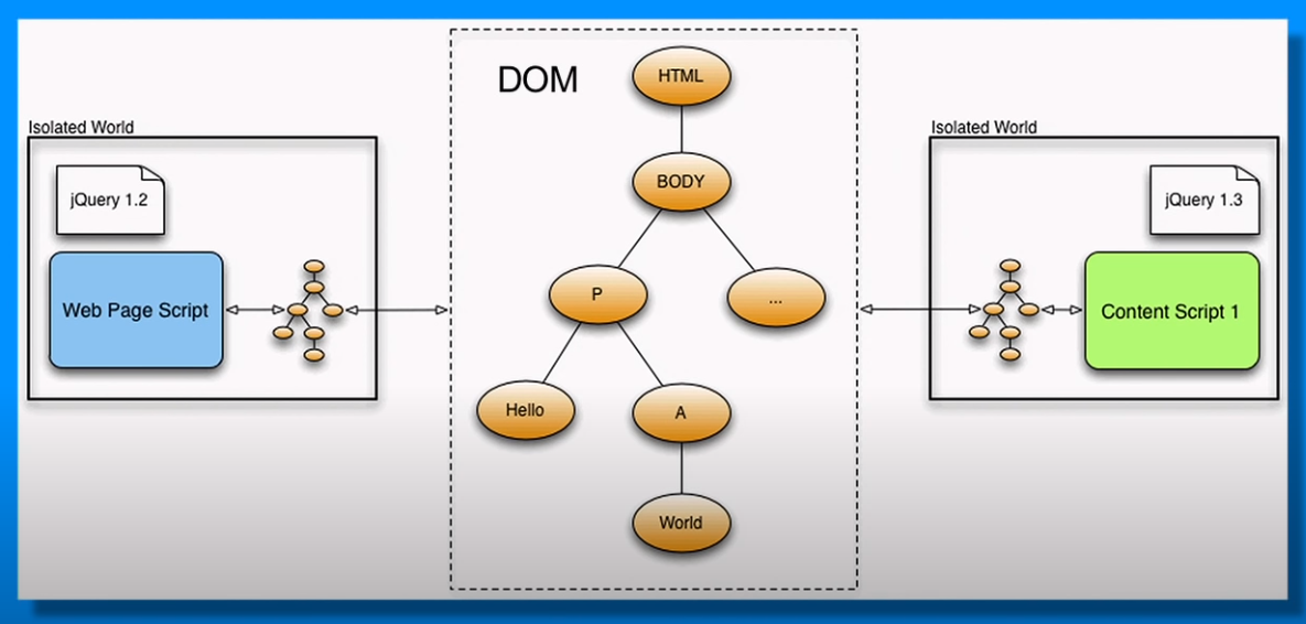 - Isolated worlds: 與原本正在瀏覽中的網頁 scope 是分開的