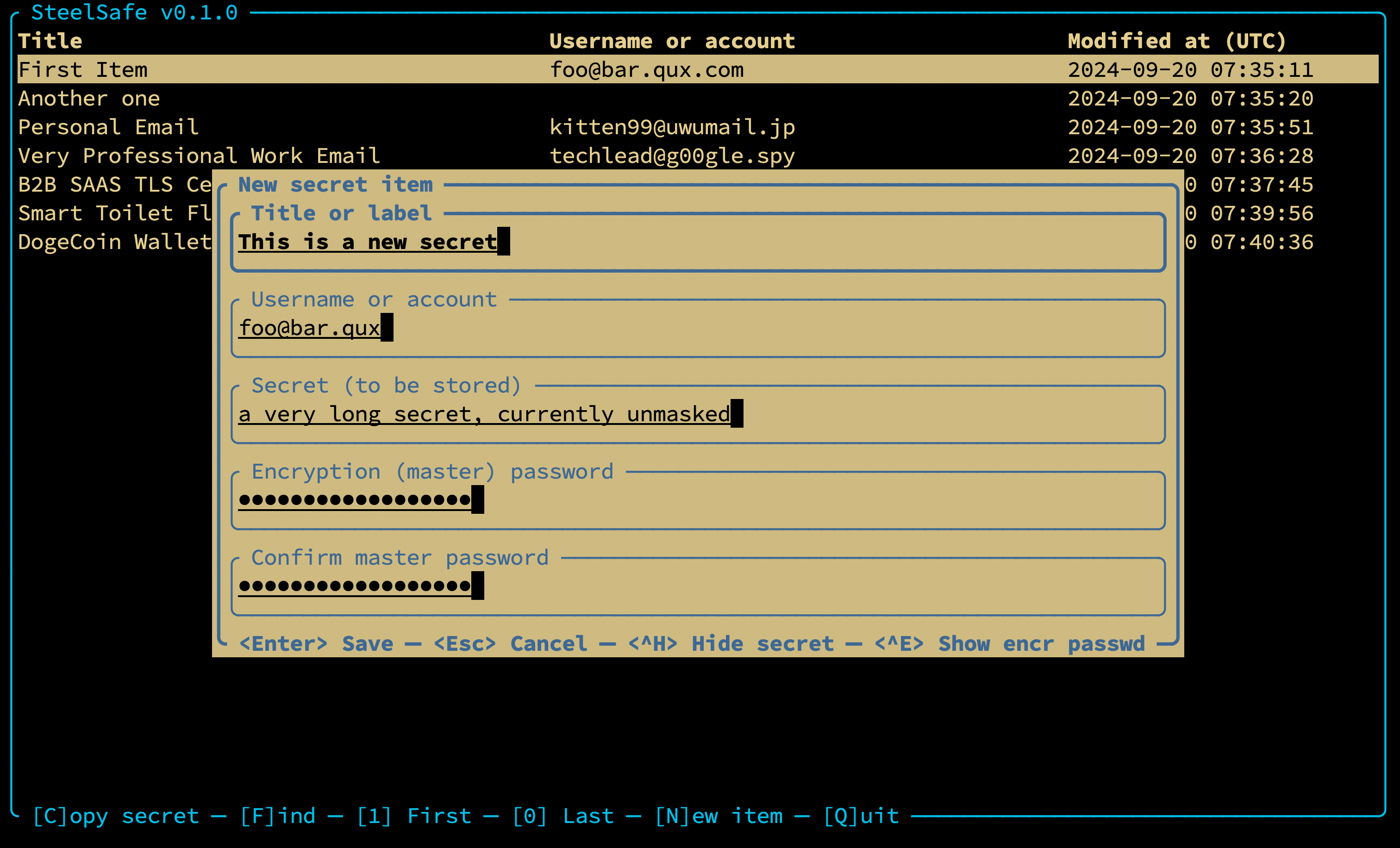 Steelsafe is a minimalistic, portable, personal password manager with a terminal user interface (TUI), written entirely in safe Rust (not counting dependencies).