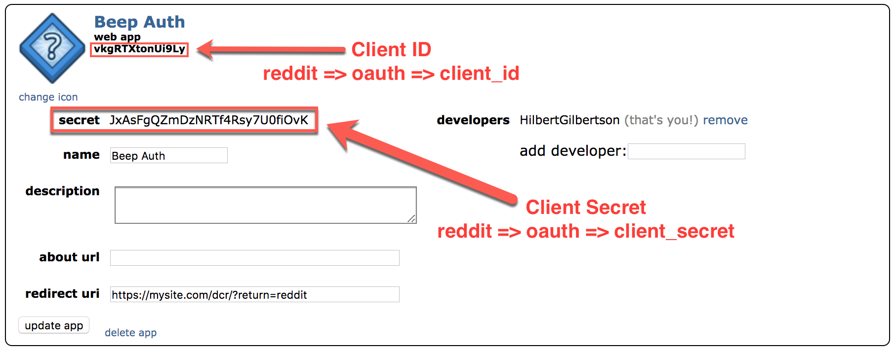 reddit => oauth => appnameto the name of your reddit app (e.g.Beep Authabove), andauthorto your reddit username (e.g.HilbertGilbertson).