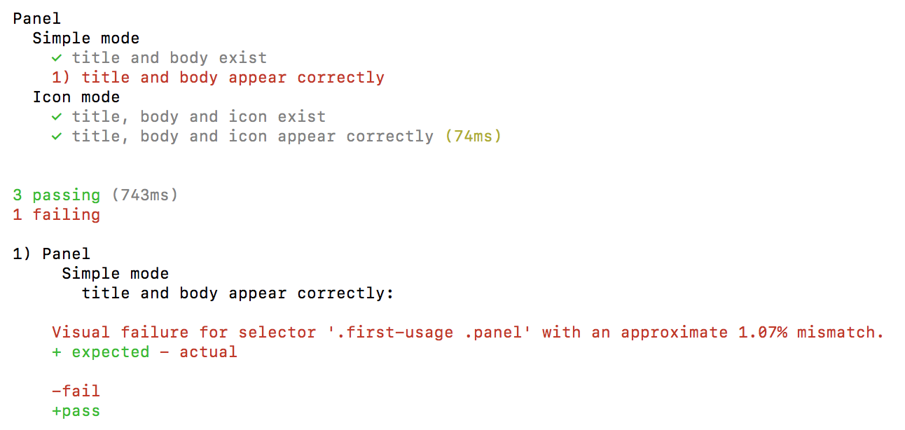 testPathPattern (--p): A glob match for test files. This is the new and recommended way.testDir (--t): The directory for Mocha to look for the test files. This is the old way of matching tests.testFilter (--f): Allows you to pass in some text to filter the test file name. This is the old way of matching tests.shouldRebaseVisuals (--b): A flag to tell the visual regression engine to replace the existing baseline visualsreportDir (--r): The directory for the Mocha reporter to dump the report filescomponentTestUrlFactory: A function that returns the url for the component test to runcomponentTestVisualPathFactory: A function that returns the path for visual tests to run invisualThreshold (--v): A value between 0 and 1 to present the threshold at which a visual test may pass or failonFinish: A function that can be used to do some extra work after Muppeteer is teared downuseDocker (--d): The option for telling Muppeteer to run Chromium in Docker to better deal with environmental inconsistencies (default)headless (--h): Determines whether Chromium will be launched in a headless mode (without GUI) or with a head (not applicable withuseDocker)disableSandbox (--s): Used to disable the sandbox checks if not using SUID sandbox (not applicable withuseDocker)executablePath (--e): The option to set the version of Chromium to use duning the tests. By default, it uses the bundled version (not applicable withuseDocker)