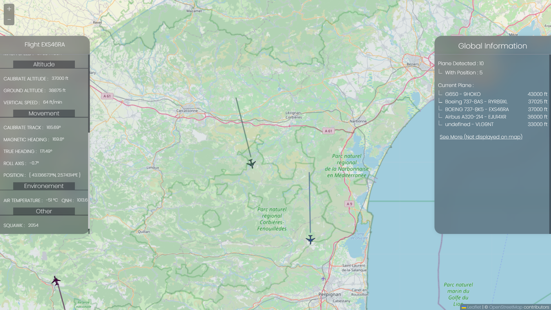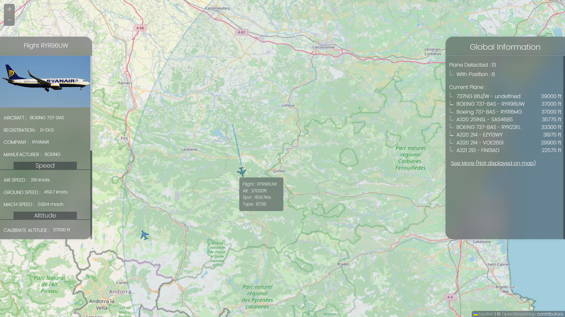 Here are some images of the interface, as you can see, you can have access to a lot of information such as altitude, speed, heading, etc... but also the image of the plane and its type, its operator or even its manufacturer !