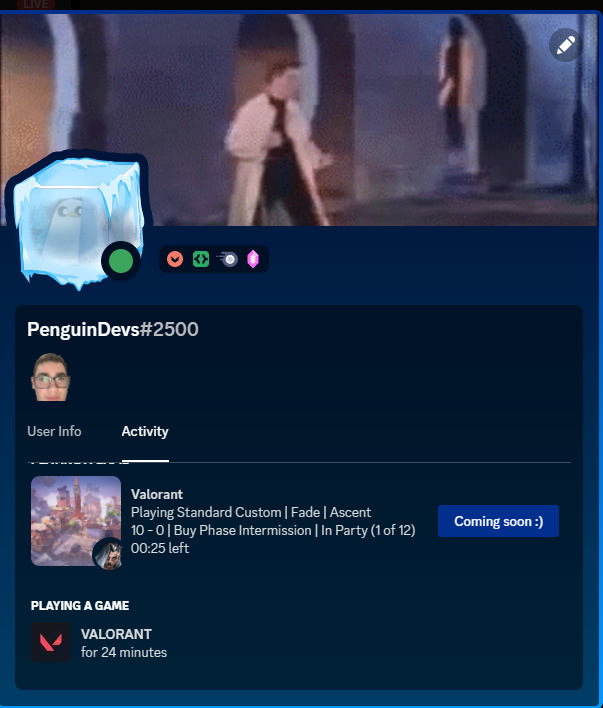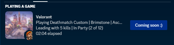 Displays a fancy status under your Discord profile through Discord's rich presence feature about your Valorant game/status, through a combination of screen reading with Google's optical character recognition and Valorant's internal API. Don't worry, this won't touch the Valorant process's memory at all :)