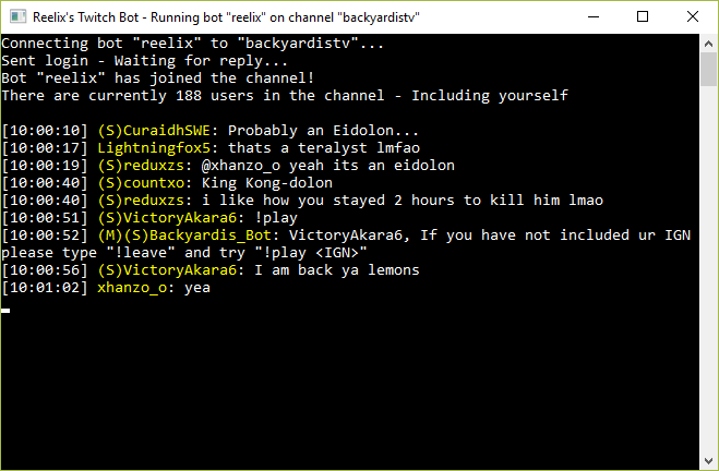 ReeTwitch A basic command-line Twitch bot coded in C# with partial Twitch "tags" support Sample Screenshot