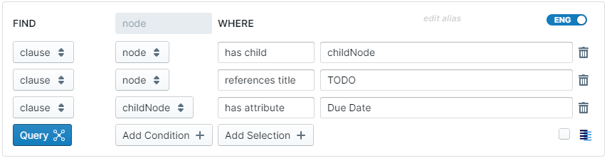 After specifying conditions and selections, hit the Query button to return results in your graph. These results will always include a text field which will link to the relevant block or page reference. Hitting Query also effectively "Saves" the query to the graph.