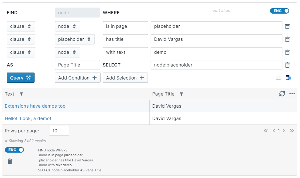 Demo showing Query Block, Query Pages, Query Drawer, Conditions, Selections and a few example queries.