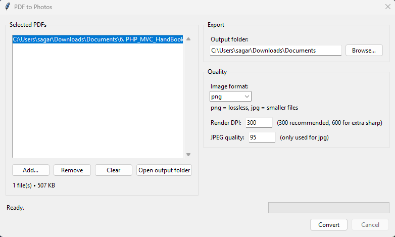 This is a simple Windows desktop app that turns your photo(s) into a PDF(s) and PDF(s) into a photo(s).
