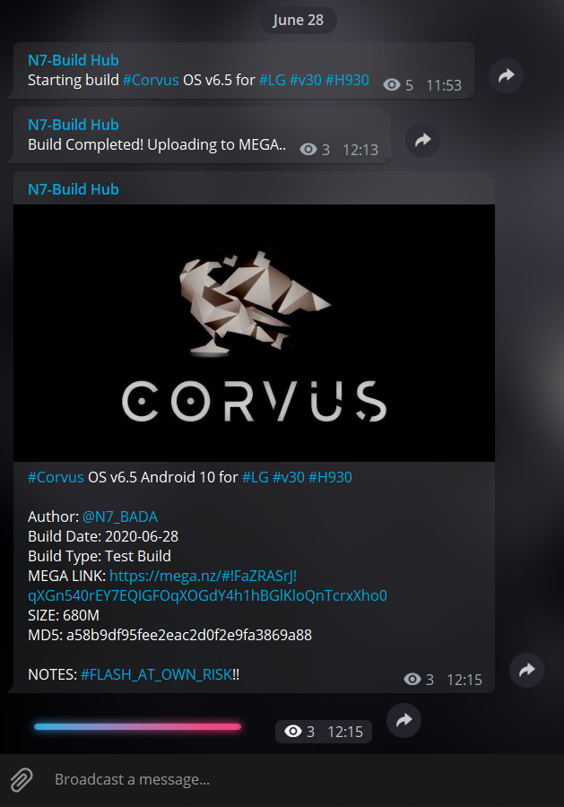 ROM_DIR="Corvus"- After all the above is set, Here's an example of the Output on Telegram after running the