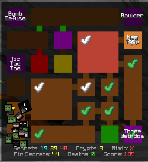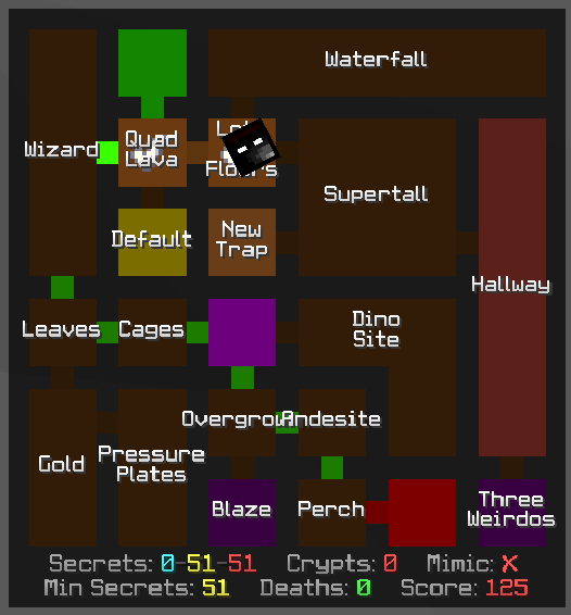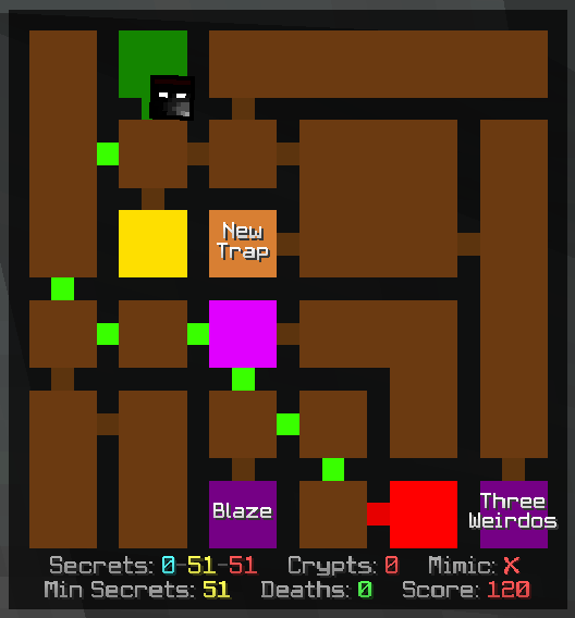 IllegalMap is a ChatTriggers module that scans the dungeon to show the user rooms which wouldn't normally be visibile to them. Other information such as the found-remainaing-total secrets, score, mimic status and crypts killed are also shown underneath the map so that the user doesn't need to open the tab list.