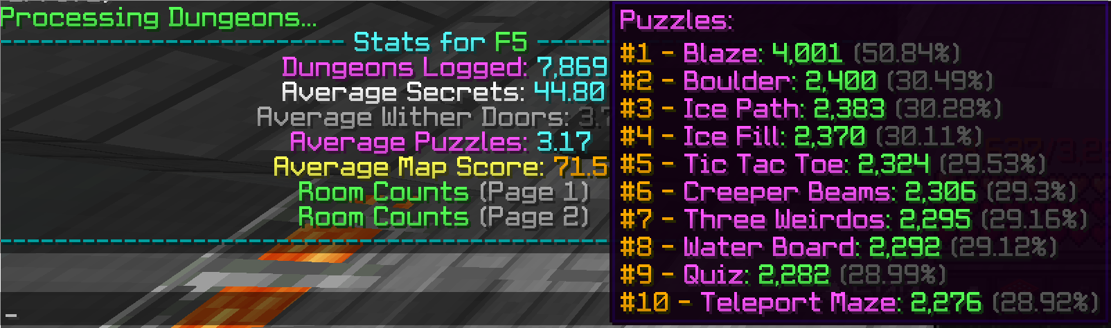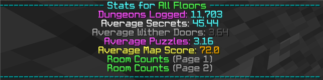 IllegalMap logs all of the dungeons that you scan. This lets the user view interesting statistics about the dungeon like the average number of secrets per floor, which puzzles or rooms appear the most (or least) or the average number of wither doors in each dungeon. The command for Dungeon Logs is "/dlogsnew [floor]". If no floor is given, then it will show the statistics for every dungeon that you have logged. The room percentages shown for rooms and puzzles show how the percentage of runs which that room appears in.