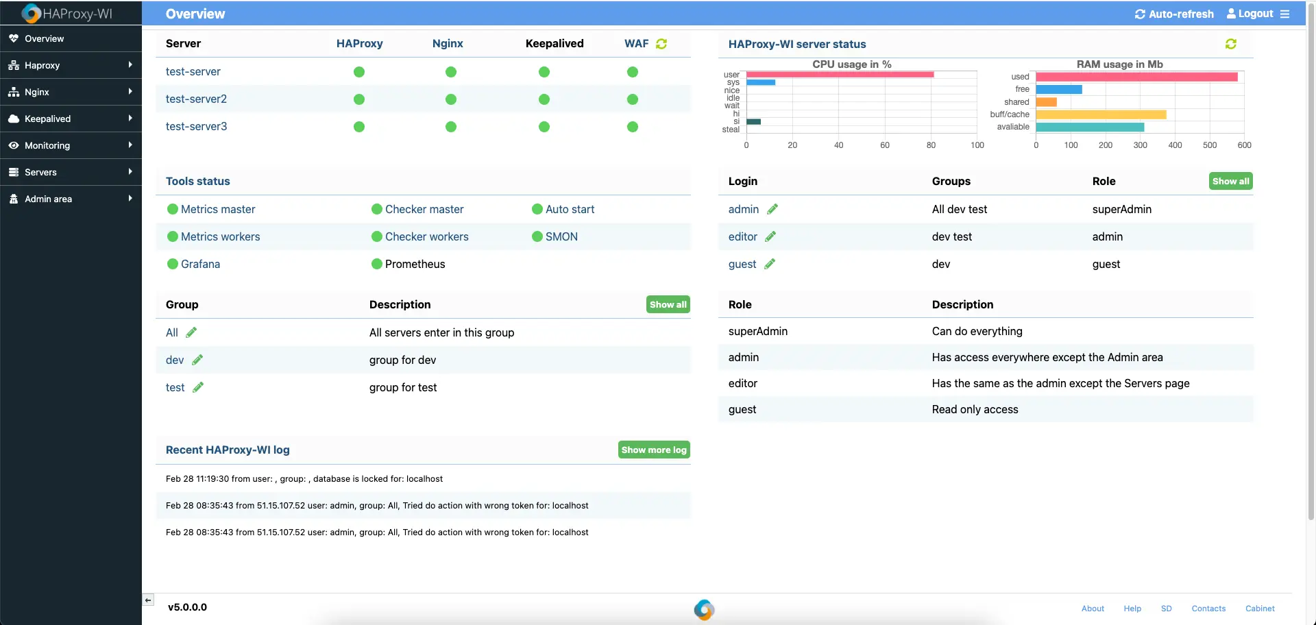 Login https://roxy-wi-server/admin, and add: users, groups, and servers. Default: admin/admin