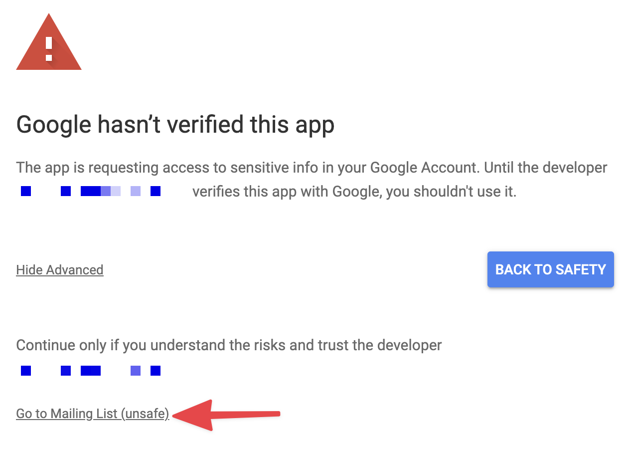 Because this script has not been reviewed by Google, it will generate a warning before you can continue. You must click the "Go to Mailing List (Unsafe)" for the script to have the correct permissions to update your form.