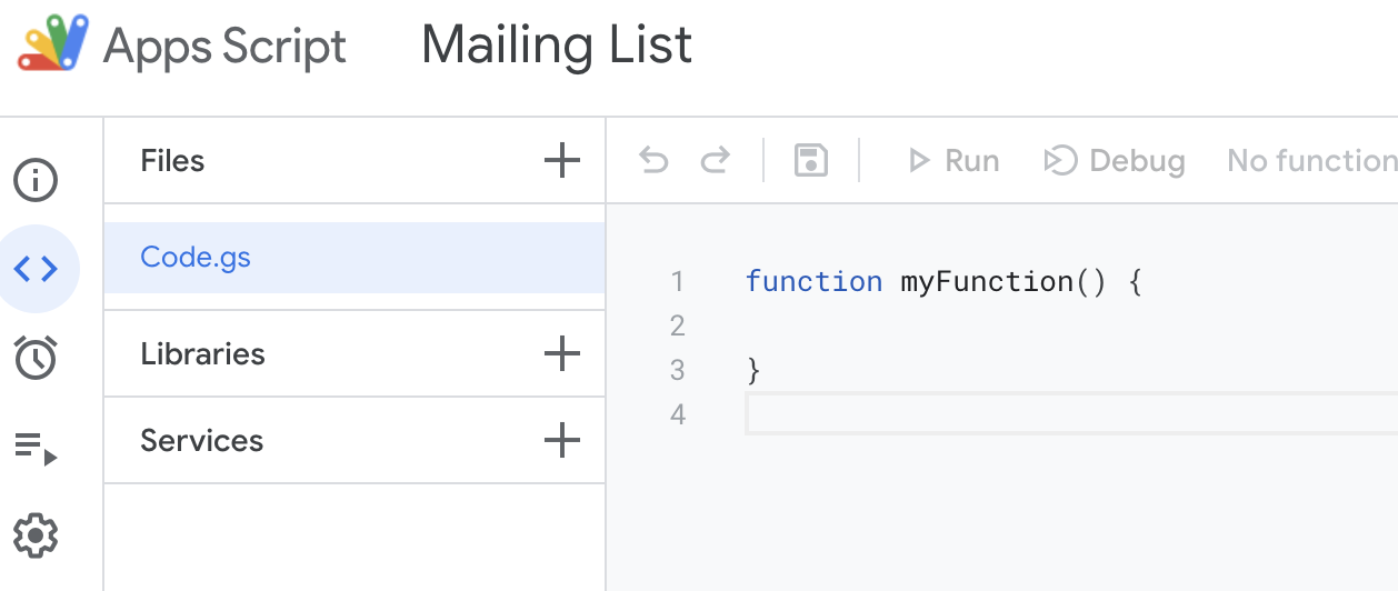 Click on Extensions -> Apps Script. This will open new Google Script. Rename it to something like "Mailing List".