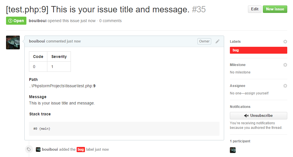 When you call Tissue::create, a Github issue is created in the repo of your choice and a "bug" label is automatically applied. Duplicates are detected, to a certain extent.