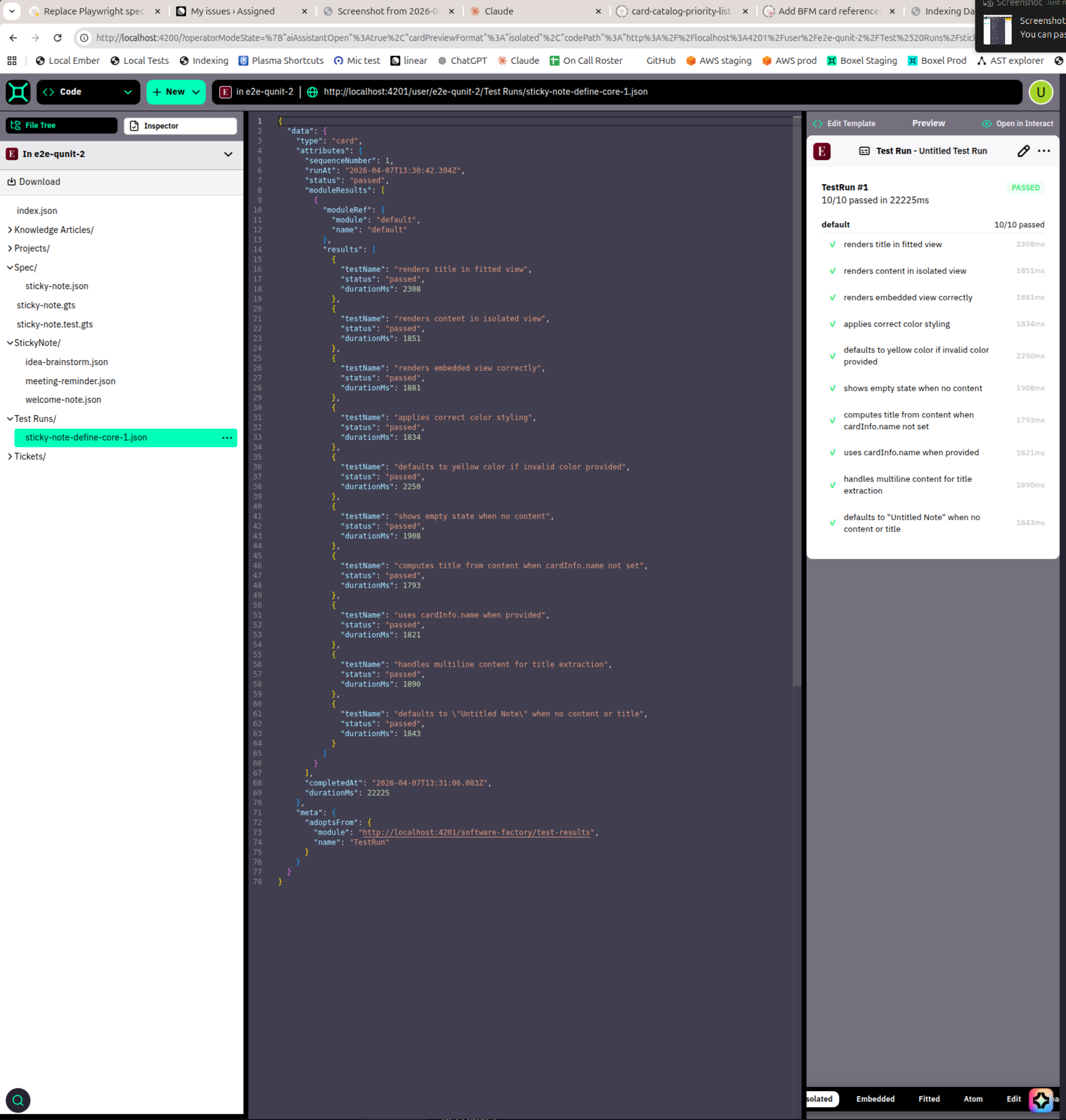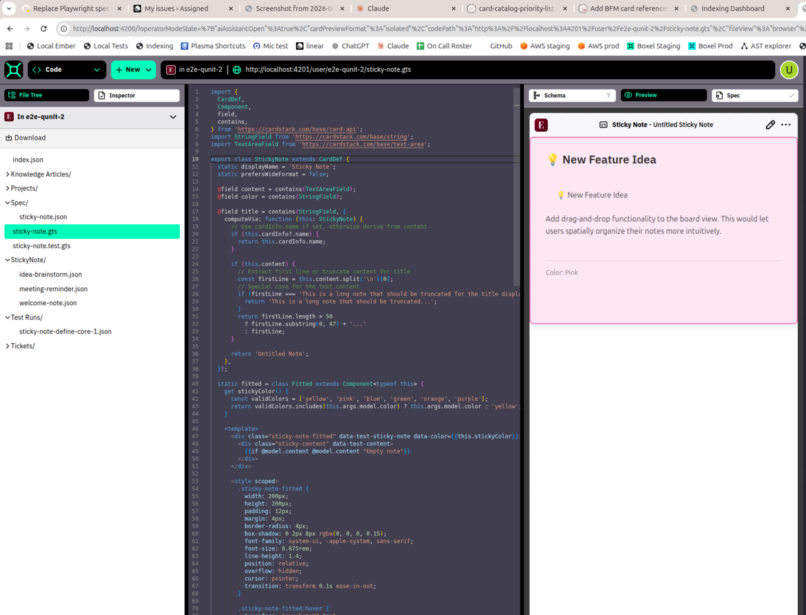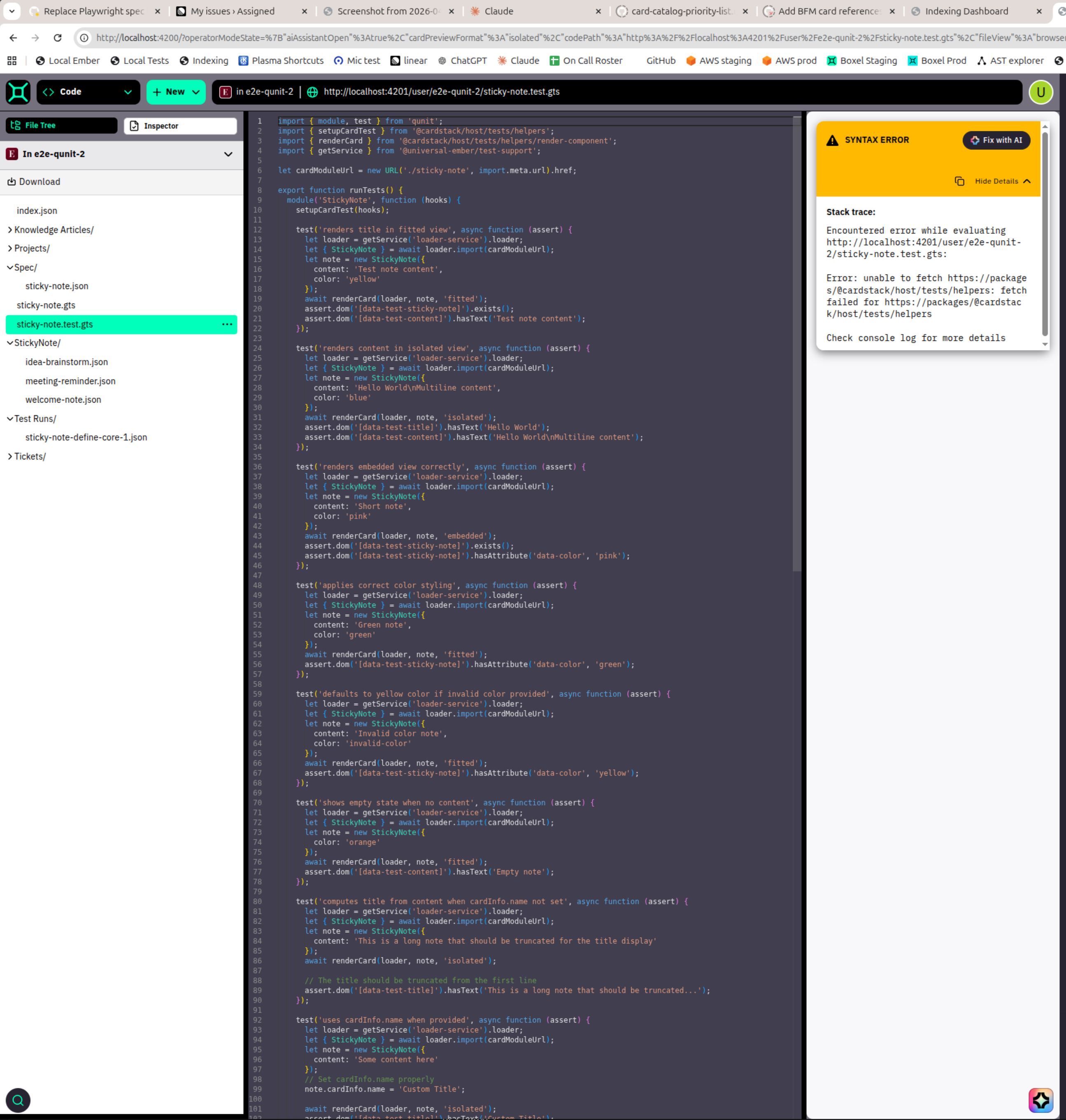 .test.gtsfile (Code Mode, showing the LLM-generated QUnit tests alongside the card definition). Note: the co-located test encounters a fetch error for@cardstack/host/tests/helperswhen viewed in Code Mode — this is a known issue related to the test helpers not being available in the realm-server-hosted Boxel app's production build (CS-10650):StickyNote card definition and preview (Code Mode, showing the