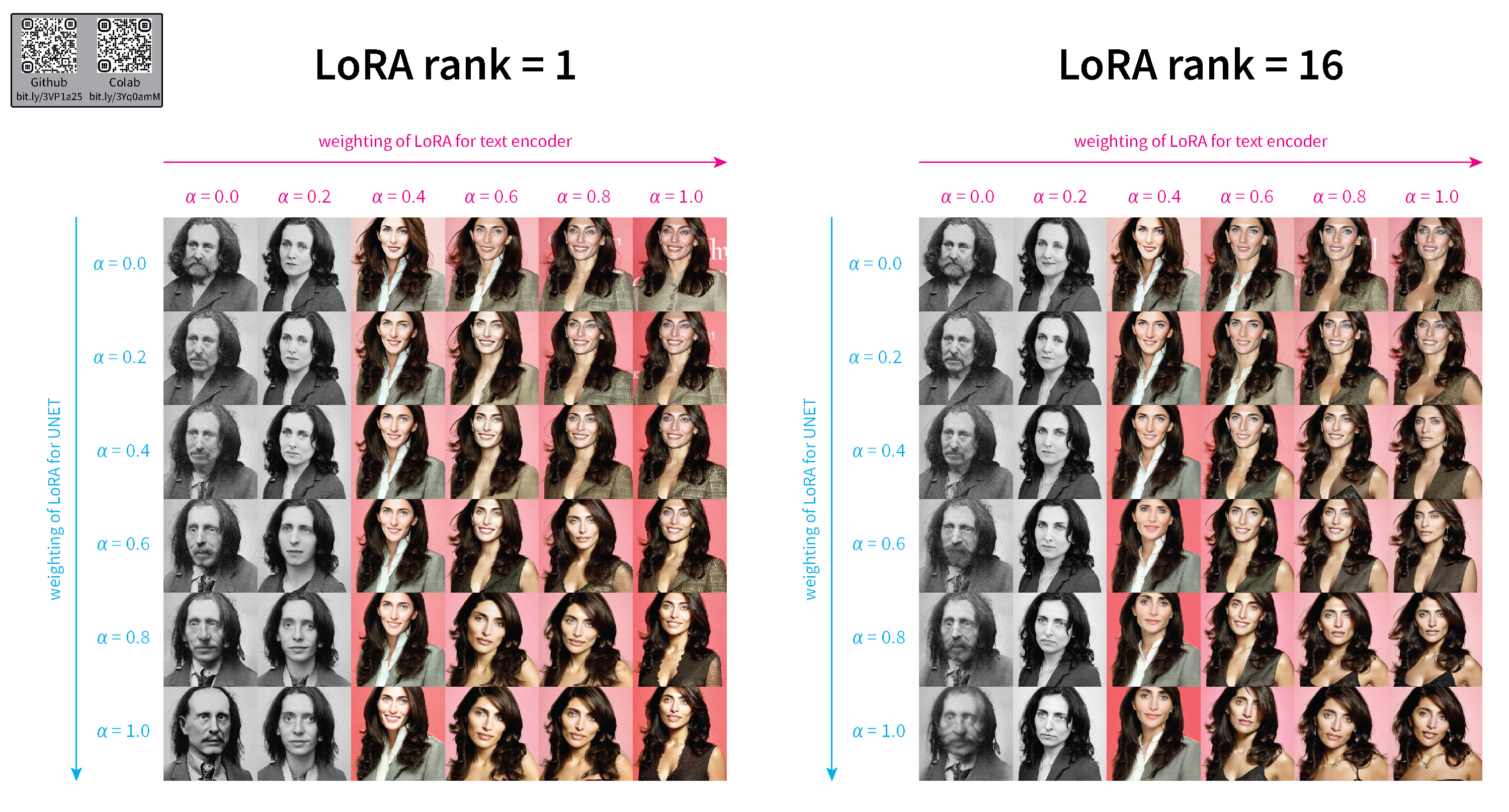 Anyways, I hope this gives you some sense of the range for exploration we get from @cloneofsimo's brilliant insight. There are one or two other hyperparameters I want to pull out for all of us to play with, so stay tuned. In case you want to play with the notebook I used for fine-tuning, you can find it in this Github repository, or follow the links directly: