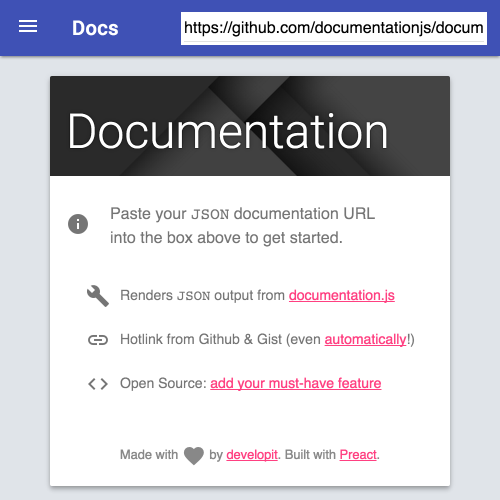 Documentation Viewer A simple standalone viewer for json output from documentation.js. Built with preact, preact-mdl and fetch. Live documentation-viewer.firebaseapp.com Screenshots