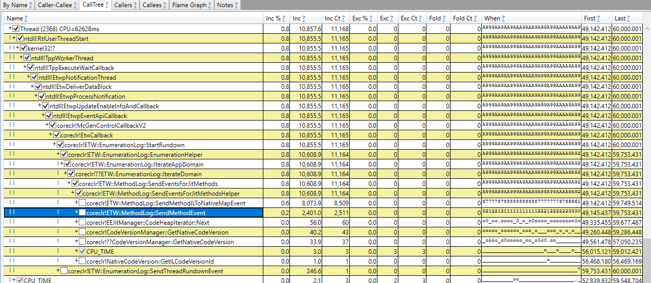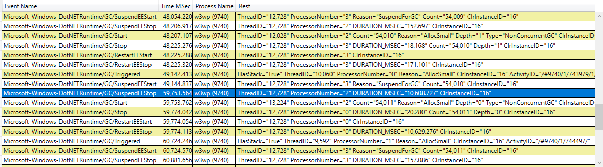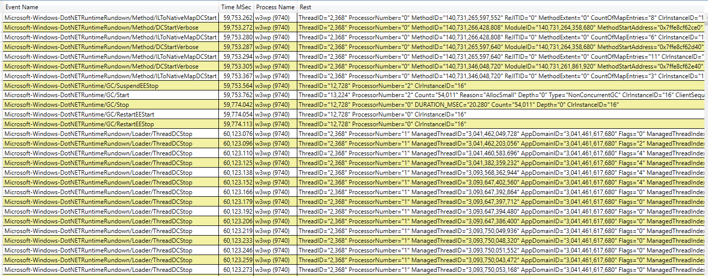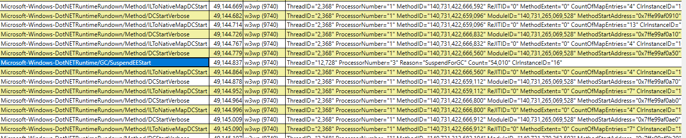 Events DCStartVerbose and ILToNativeMapDCStart go on for 10s. Only after they stop do we find SuspendEEStop