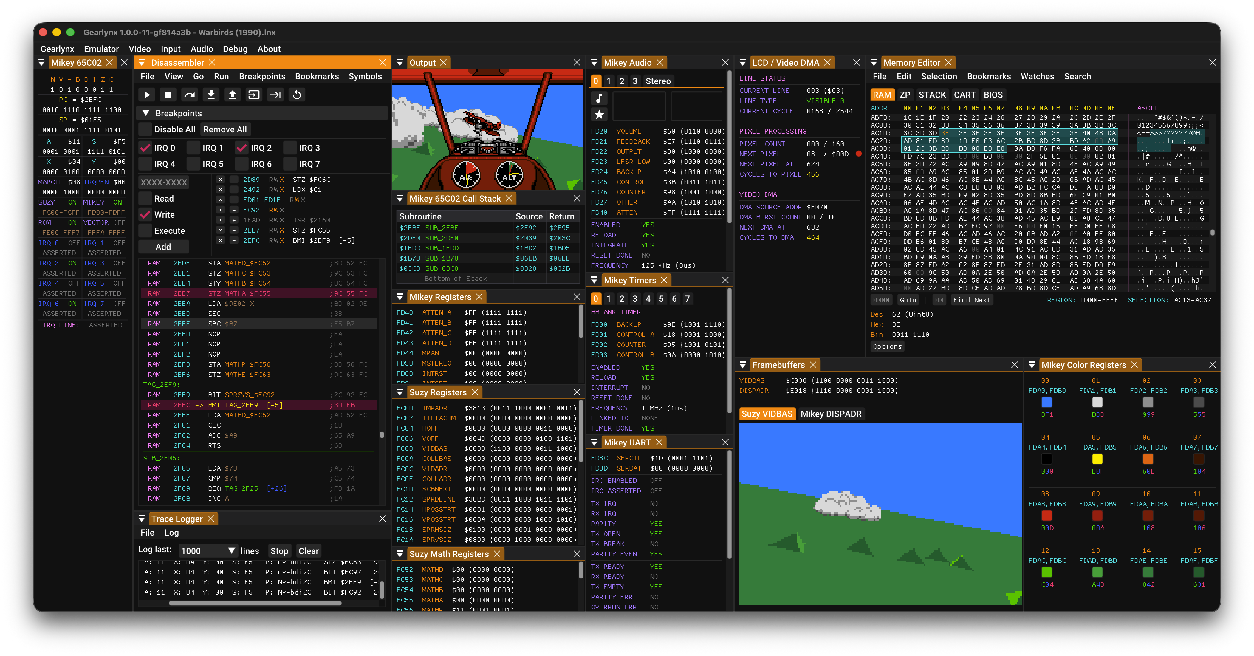 - Full debugger with just-in-time run-ahead disassembler that can handle self-modifying code, CPU and memory breakpoints, code navigation (goto address, JP JR and JSR double clicking), debug symbols, automatic labels, memory editor, memory search, Suzy and Mikey register viewer, audio channels, UART, cartridge and video inspector.