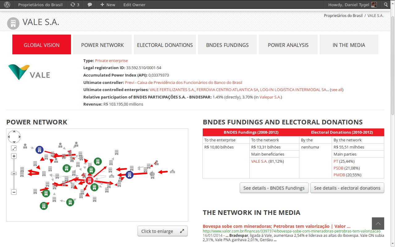 1. Factsheet page of an owner (Section: global vision). The factsheet comes out of the box with the following sections: Global Vision, Power Network (graphic and list views), Related articles, In the media. This screenshot exemplifies the plugin's hooks: the hooks are used to add two more sections (electoral donations and public fundings), and also to change the name of a section ("Related articles" was renamed to "Power analysis")