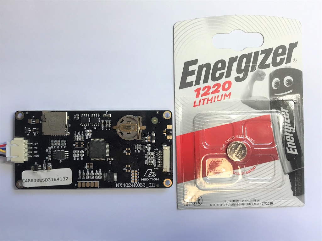 To get the Real Time Control and the backup saved functions (screen saver, memory bank etc ...) you need also to put into the Nextion screen a Battery type CR1220 :
