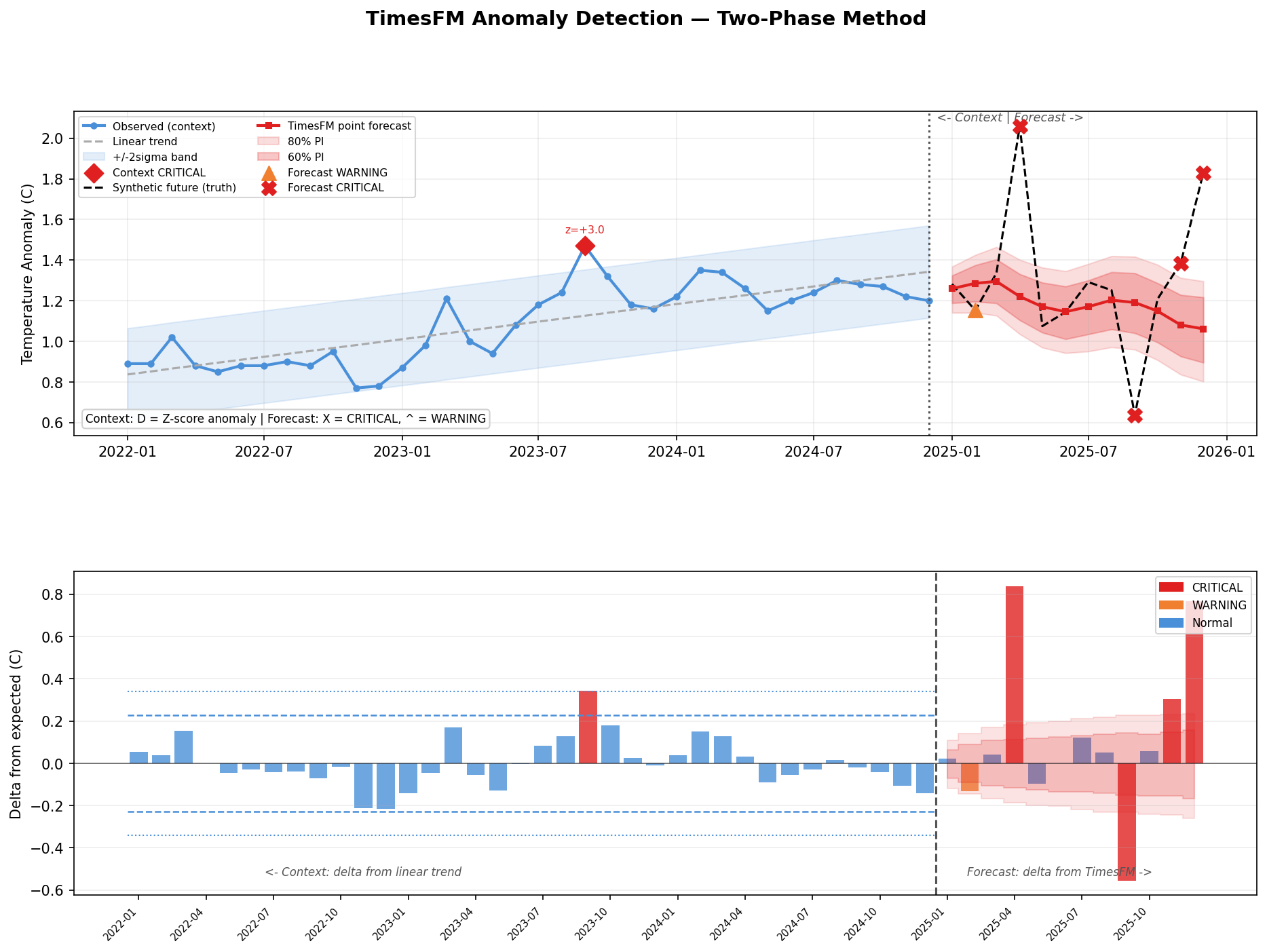 🔍 Example 2 — Anomaly Detection (Two-Phase Method)📁 TimesFM has no built-in anomaly detection, but its calibrated quantile intervals make it a natural fit. This example uses a two-phase approach combining classical detrending with TimesFM's prediction intervals. 📊 Anomaly Detection OutputHow it worksPhase 1 — Context (historical 36 months, 2022–2024):