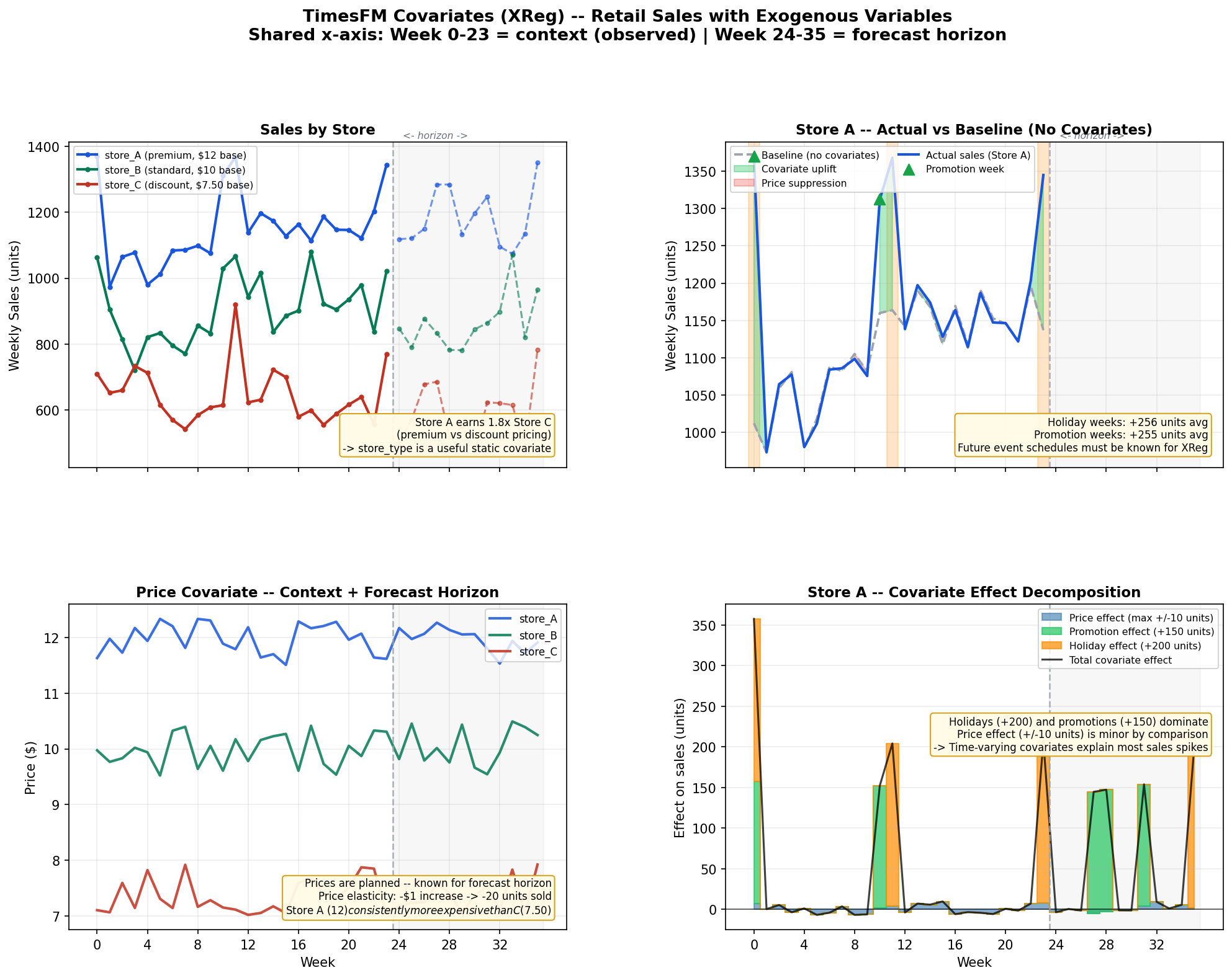Output CSV: 108 rows (3 stores × 36 weeks = 24 context + 12 horizon) Covariate types used