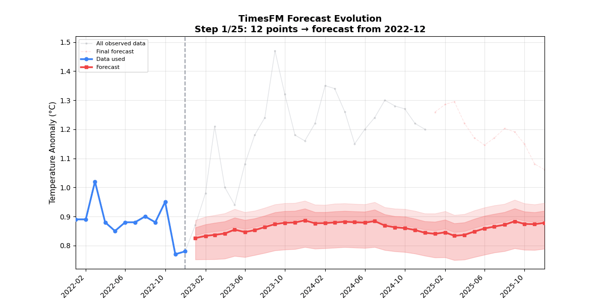 🌡️ Example 1 — Global Temperature Forecast📁 The baseline example. Loads 564 rows of NOAA global temperature anomaly data (2022–2024), runs a zero-shot 12-month forecast with TimesFM 1.0, and outputs a static visualization plus a 25-frame animated GIF showing how the forecast evolves as more historical context is added. 📊 Forecast Visualization🎬 Forecast Evolution Animation (25 frames)Each frame adds one month of context (12 → 36 months). Watch the forecast tighten as the model sees more of the warming trend. Key metrics