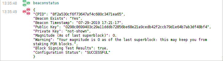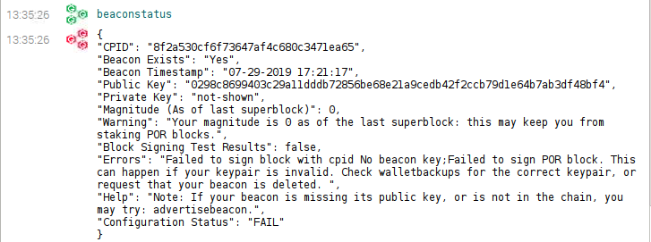 This is from a newly advertised beacon on testnet with a locked wallet. Unlocking the wallet changes the output to:
