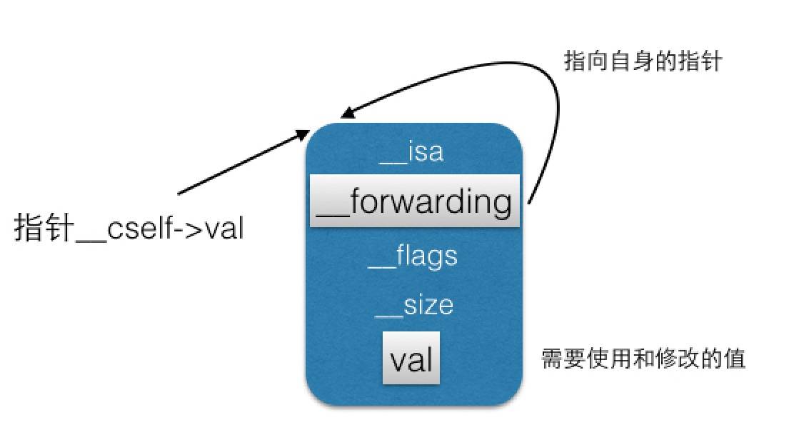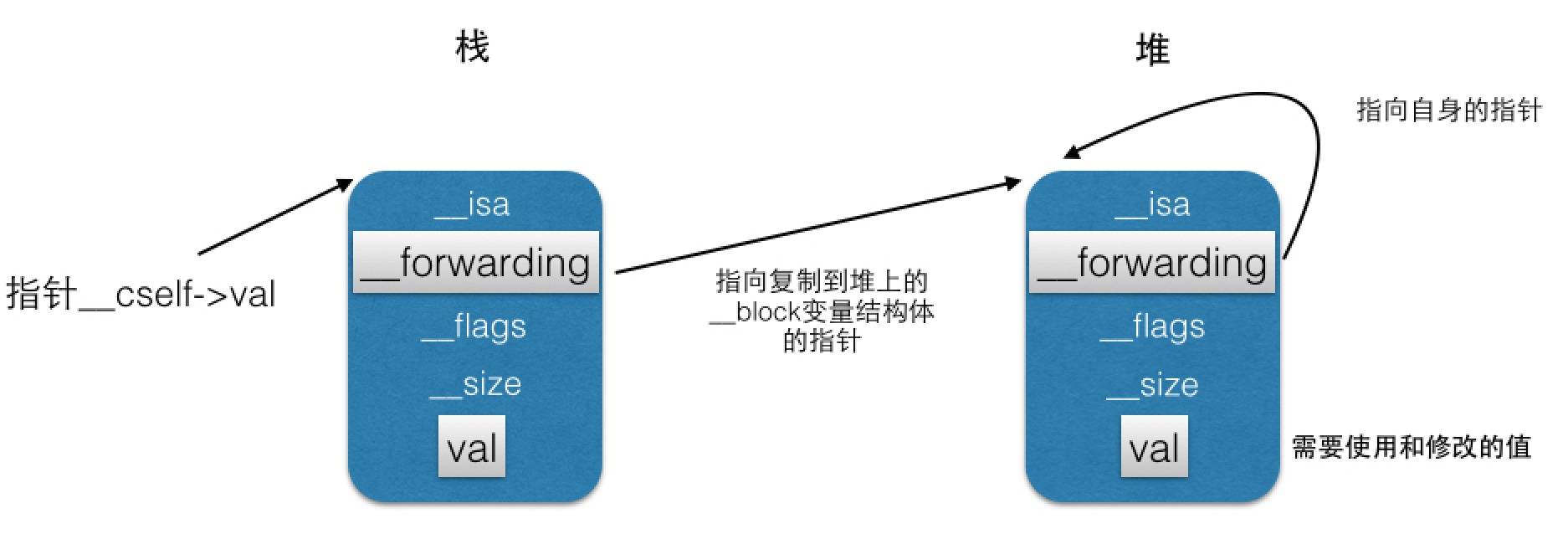 __forwarding指针这里的作用就是针对堆的Block,把原来__forwarding指针指向自己,换成指向_NSConcreteMallocBlock上复制之后的__block自己。然后堆上的变量的__forwarding再指向自己。这样不管__block怎么复制到堆上,还是在栈上,都可以通过(i->__forwarding->i)来访问到变量值。