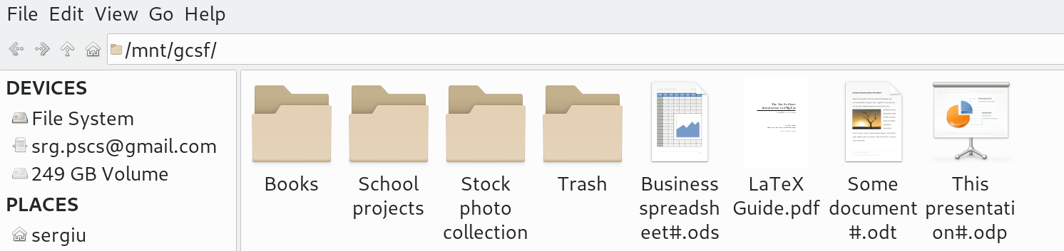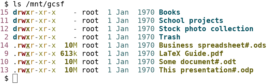 INFO gcsf > Mounted to /mnt/gcsfYou can now find the contents of your Drive account in /mnt/gcsf: