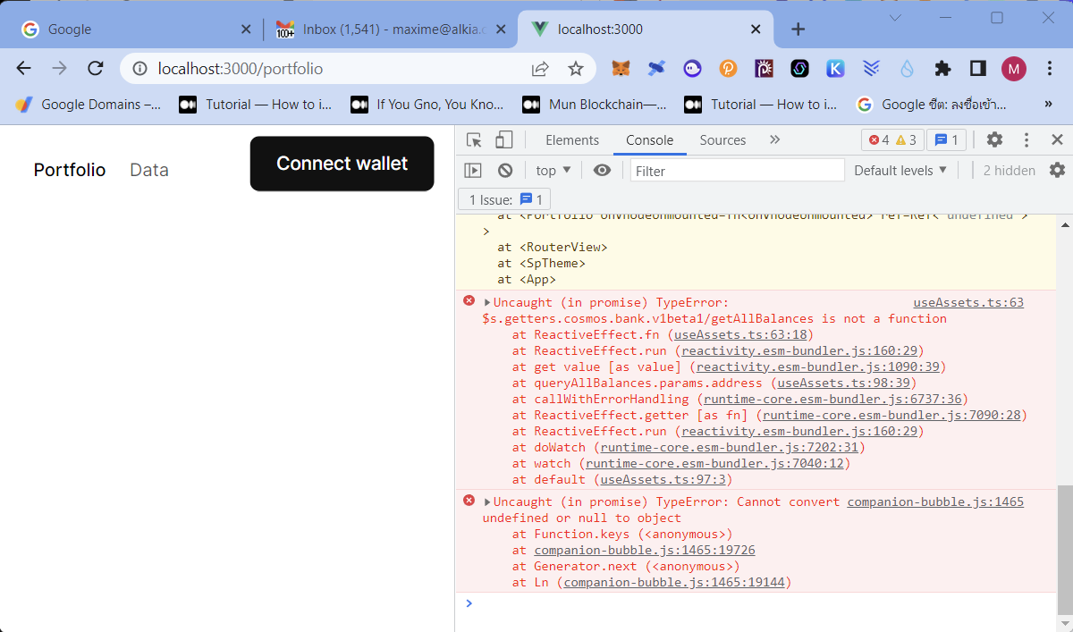 $ ignite chain serveDocumentation: https://docs.ignite.com Cosmos SDK's version is: stargate - v0.46.6 🛠 Building proto... 📦 Installing dependencies... 🛠 Building the blockchain... 💿 Initializing the app... 🗂 Initialize accounts... 🙂 Added account alice with address cosmos17pd9qlexwseg0su0gsev0ejf7xxuesc4el2y82 and mnemonic: tone blue ketchup exhaust attitude above lottery defense grocery pistol pear surprise thank diesel say hen swear wide jealous crack fetch air ensure burger 🙂 Added account bob with address cosmos1z44r2vhrddhm0scatvxzj59cygpjh7xjh4chsm and mnemonic: donkey cave diesel mad spider code series cause matter error lucky people useful moral flock butter globe diary mercy bulb indicate inch trick pumpkin 🌍 Tendermint node: http://0.0.0.0:26657 🌍 Blockchain API: http://0.0.0.0:1317 🌍 Token faucet: http://0.0.0.0:4500 2. $ cd vue $ npm install Package 'mars-client-ts' located at '../ts-client' needs to be published and your package.json file updated. added 284 packages, and audited 286 packages in 1m 23 packages are looking for funding run `npm fund` for details 7 vulnerabilities (2 moderate, 5 high) Run `npm audit` for details.$ npm run dev
