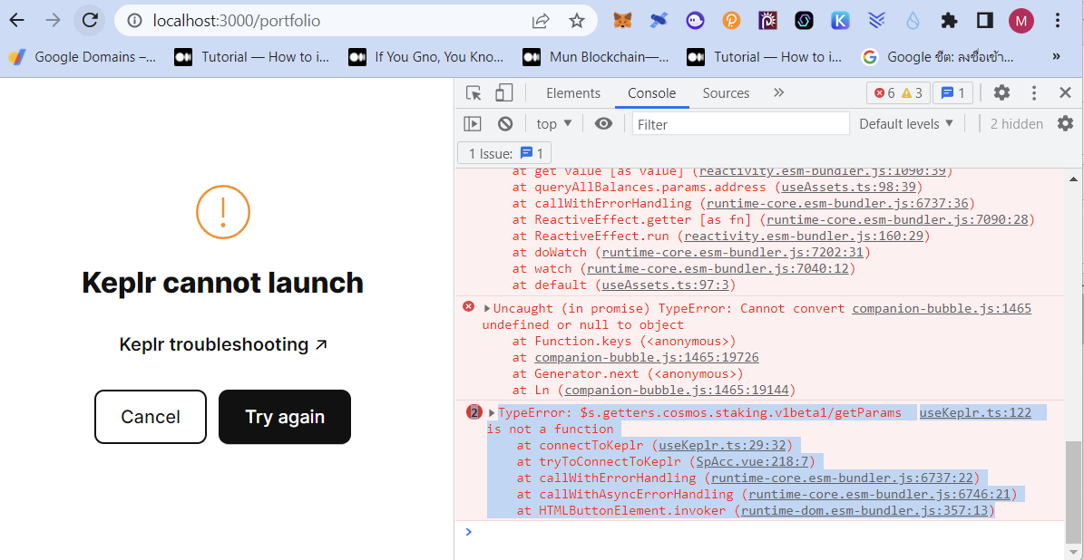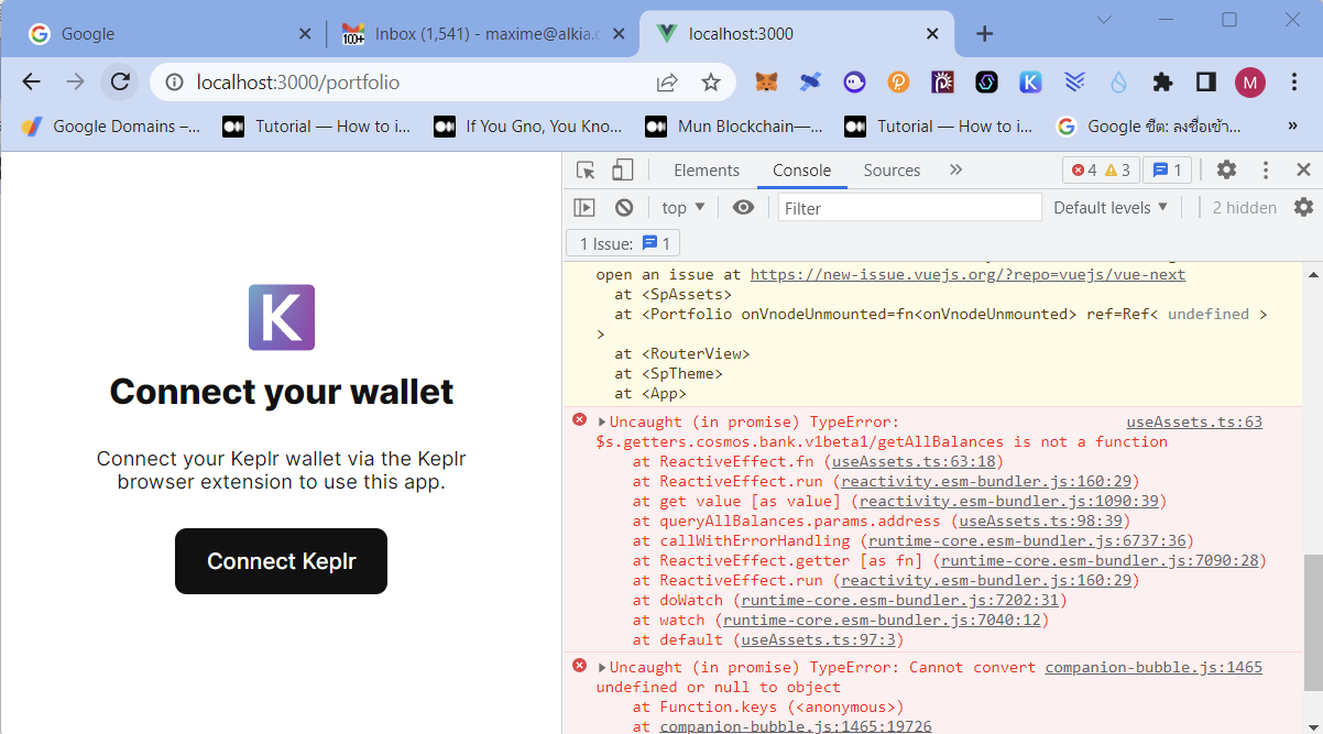 The VUE template scaffoled from igniteCLI which worked perfectly when connected with a Keplr client in version 0.23 (at the first ignite chain serve: you had something that worked on any browser with Keplr, which give a great confidence in the CLI quality and end-2-end capacity) but it no longer works directly in .24, and .25.2 we get "Keplr cannot launch"?