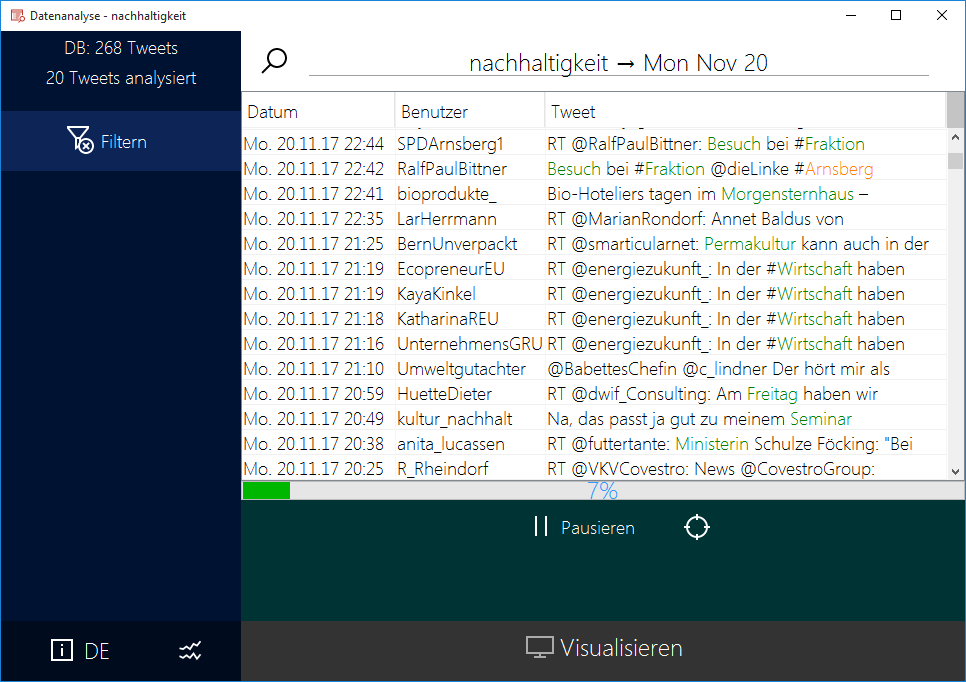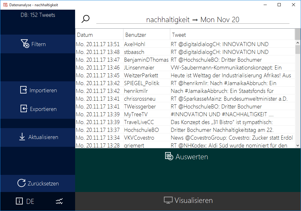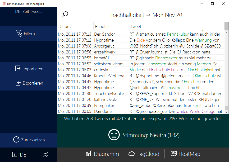 Tweet-Analyzer is a Java-based application that allows you to collect and analyze english and german Tweets, utilizing Twitter4J and Stanford NLP. Analysis findings can furthermore be displayed in the form of heatmaps, tagclouds and basic charts.