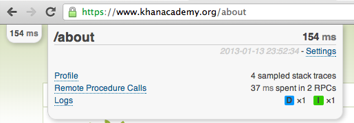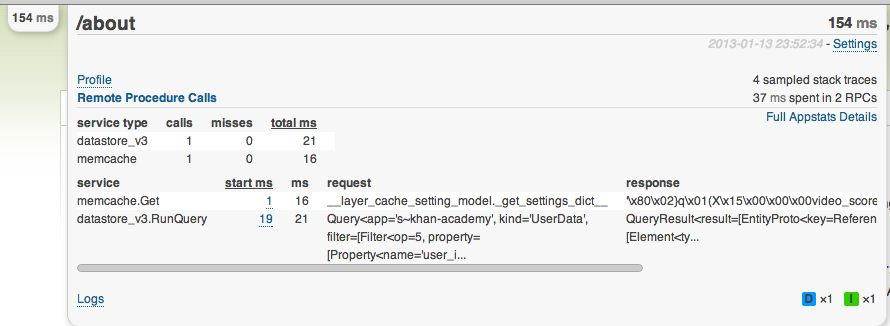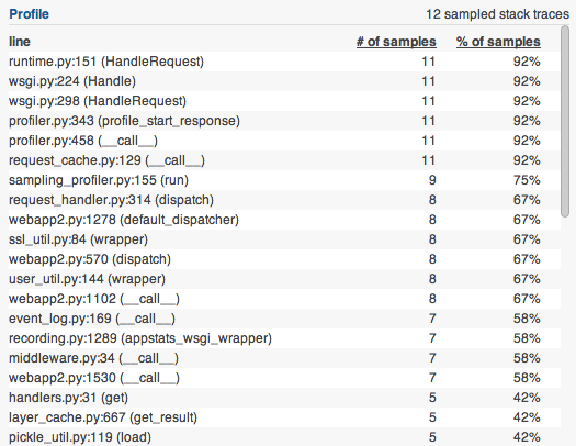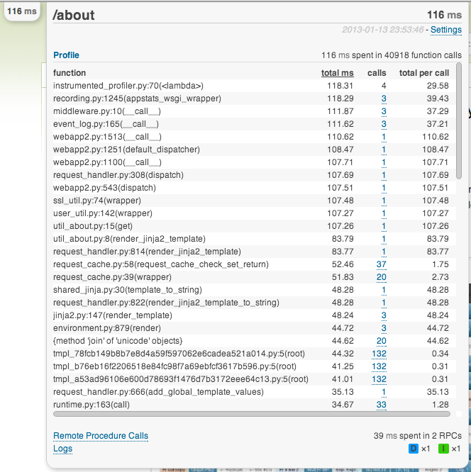 - Summaries of RPC call types and their performance so you can quickly figure out whether datastore, memcache, or urlfetch is your bottleneck