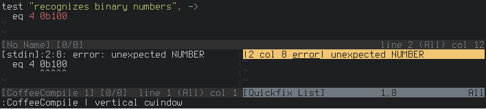 If compiling a snippet results in a compiler error, CoffeeCompile adds that error to the quickfix list.