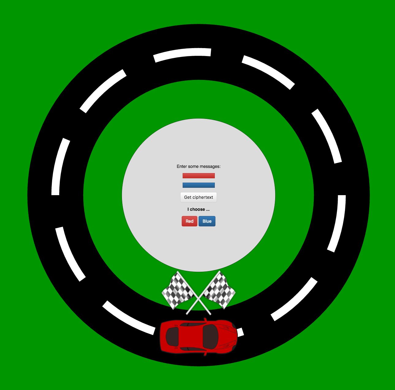 cat BMP_HEADER OUT > IMG.bmpSince this is obviously the encrypted form of "bottom right" which we defined as blue, we click blue on the challenge and our car moves 1/40th the way around the circle.