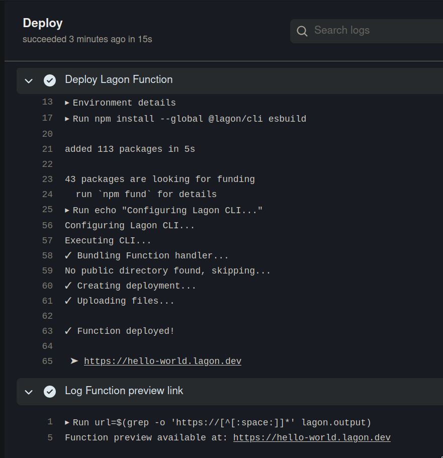 Ok, action should be merge-able now. Lots of real testing. I have added support for passing in a config object which will override the functions existing one or useful if you never committed one. Also, another important part I almost forgot. This action allows you to run any CLI command right ? Well that is so you can than perform other steps like maybe send an email of a preview link to your function in a slack channel or something. I have achieved this by saving the CLI output to a local file called here is an example of the action being used in a workflow to deploy a function than log the preview. You can see the workflow for this here. here is an example of what the action does if the CLI errors. I encountered lagonapp/lagon#696 which made the action really difficult to exit correctly but I found a decent enough workaround but it's very brittle.... |