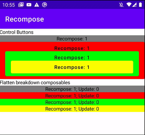 如果所有的可组合函数都打包到可组合函数中,你会注意到它们都一起重新组合,无论哪个状态变量发生变化。