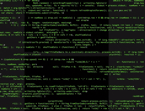 The famous Matrix rain effect of falling green characters in a terminal with node.