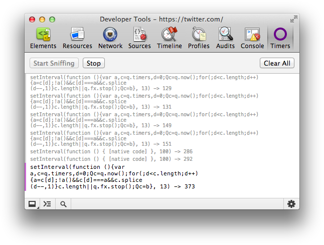 The sniffer monkey patch (extend without altering the original source code) setInterval method: