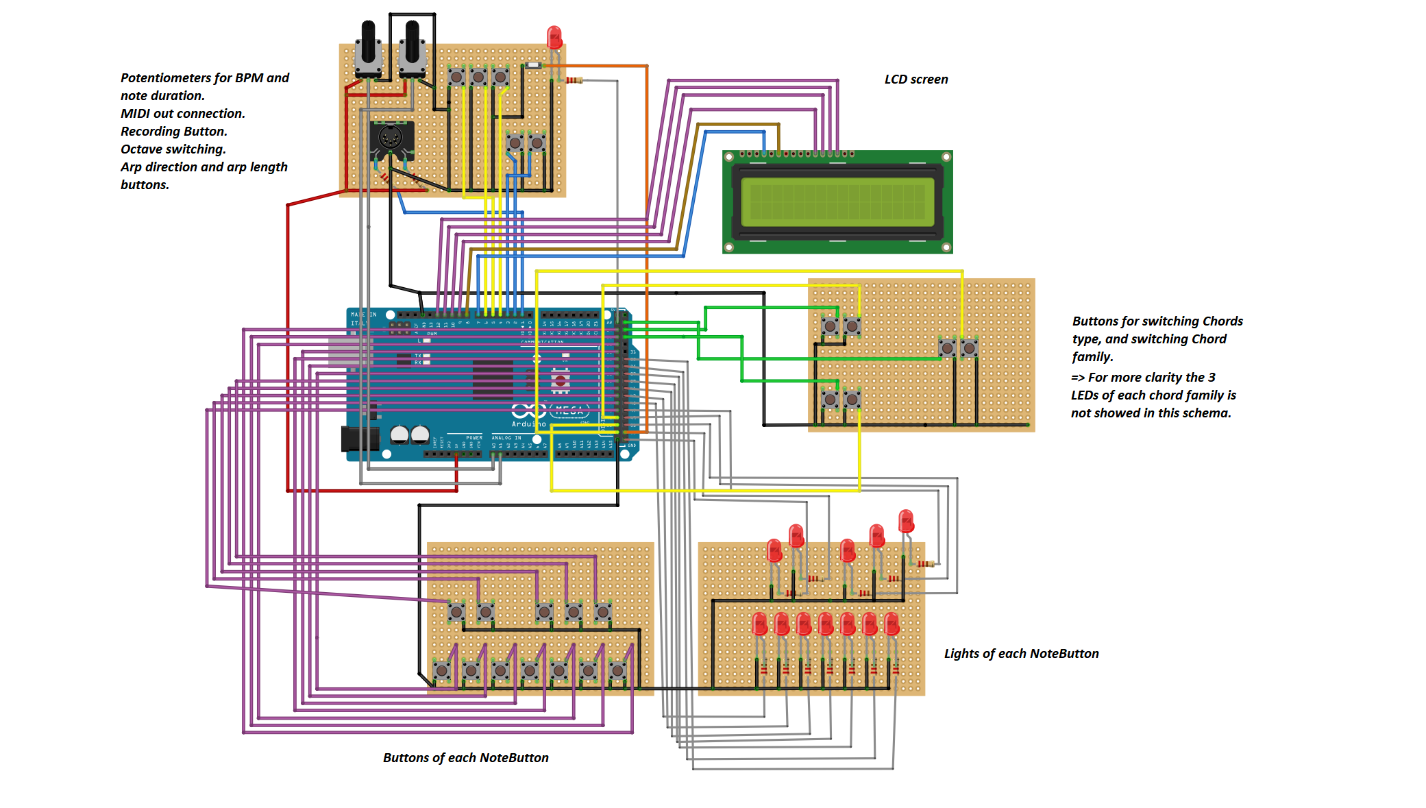 Here is a synthetic representation of main connections of the project. Because the schema is already is very compressed I don't show some connections about the lighting because it would lead to too much confusion. Many improvements can be made, because I am not familiar in C language, all the code and more globally the use of Arduino connections will be made clearly better in the future versions. Please just take this schema as an help.