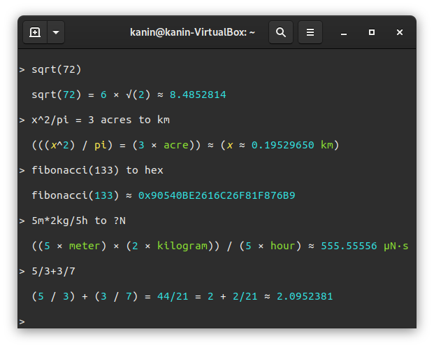 For more details about the syntax, and available functions, units, and variables, please consult the manual (https://qalculate.github.io/manual/)
