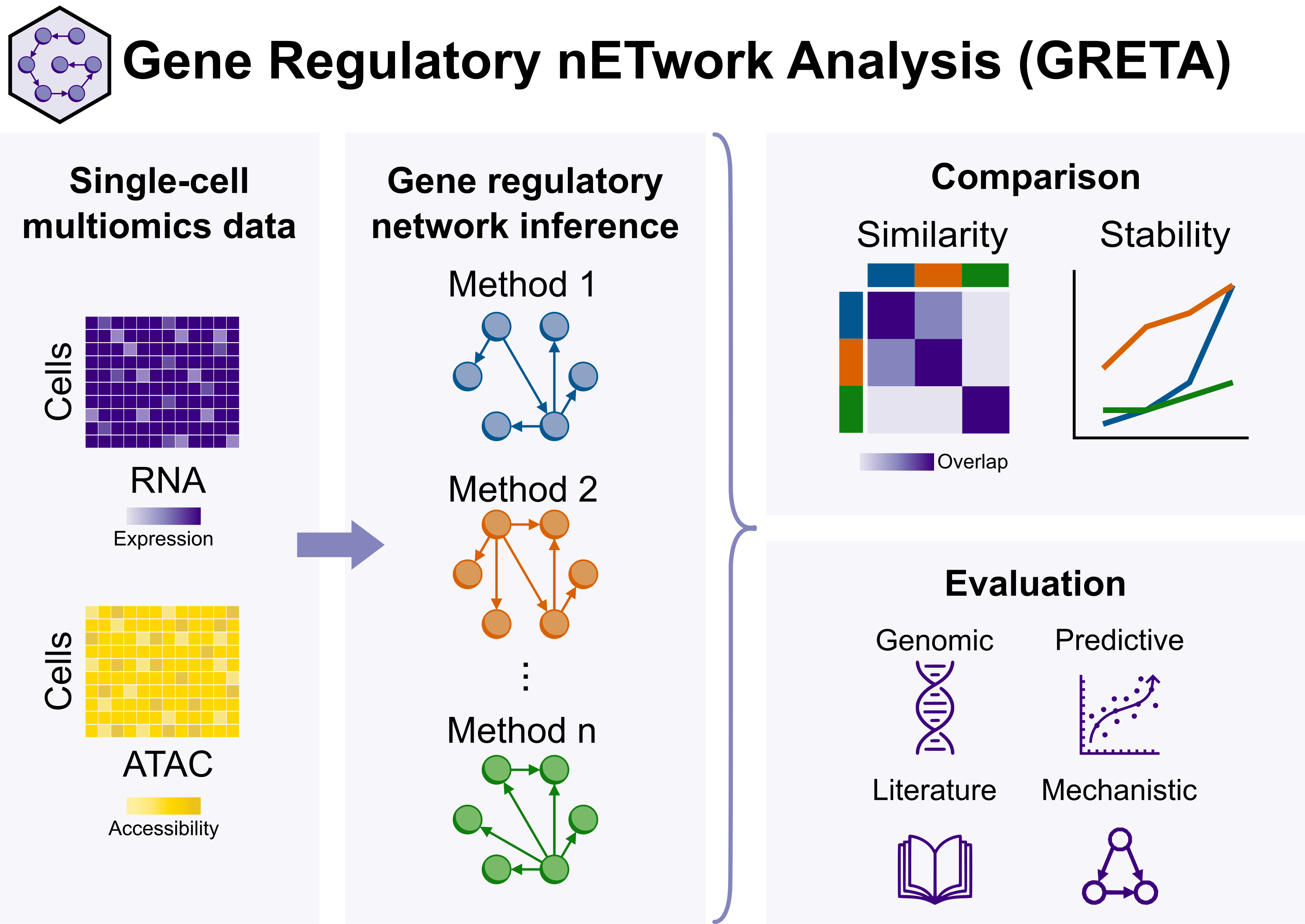 gretapy is a comprehensive framework for benchmarking and evaluating gene regulatory networks (GRNs) inferred from single-cell multiome (RNA+ATAC) data. It provides a systematic evaluation across four complementary dimensions: prior knowledge validation (TF markers, known TF-TF interactions, reference networks), genomic annotations (TF binding sites, cis-regulatory elements, chromatin-gene links), predictive performance (pathway enrichment, expression correlation), and mechanistic validation (perturbation forecasting, Boolean network simulations). The package includes built-in GRN inference methods, curated benchmark datasets, and visualization tools to facilitate rigorous comparison of network inference approaches.