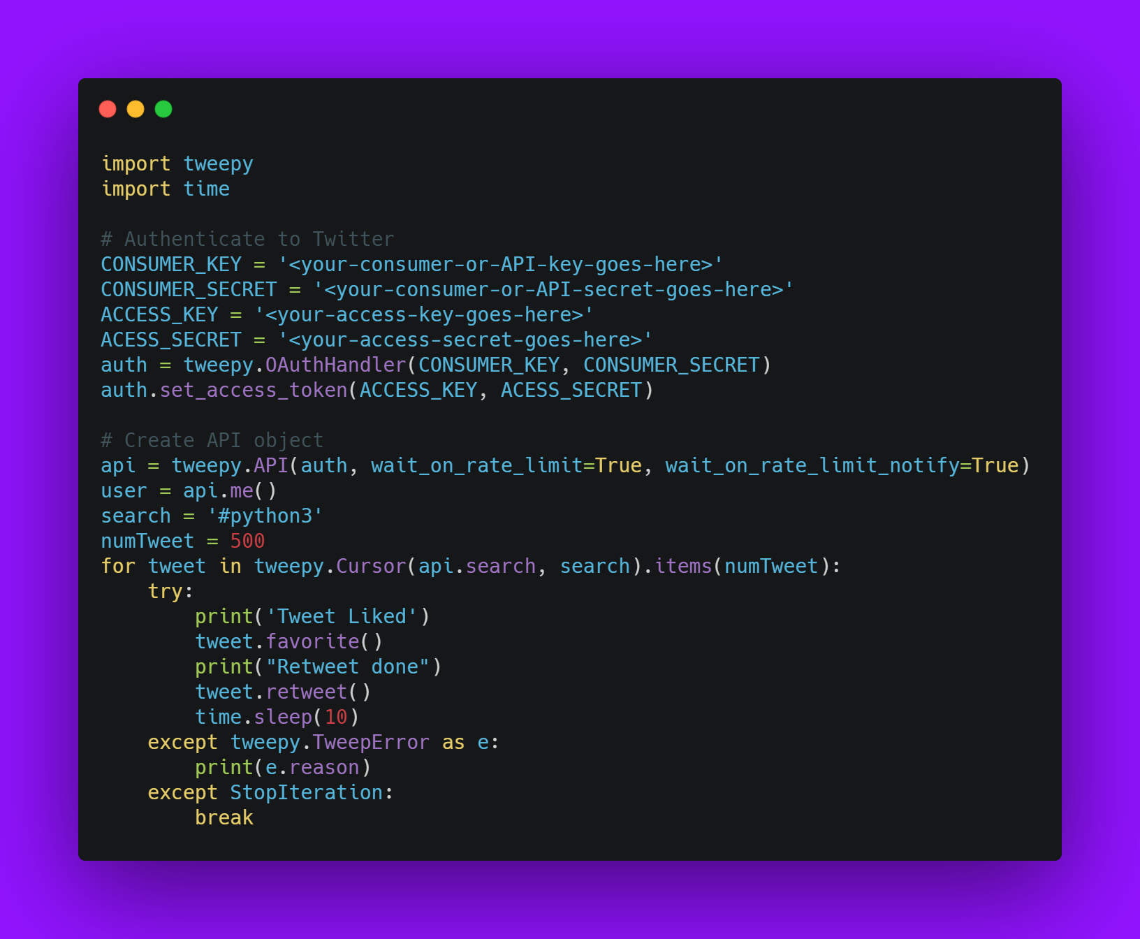 Finally, we will tell the program to look for the keyword #python3 in a tweet and the number of tweets that will be processed once in a day. If you want to like, you can use tweepy.favorite() , and for retweet tweepy.retweet(). The reason, I'm using sleep is, twitter has some guidelines, you must follow otherwise, your account will be restricted. There is a limit for liking the number of tweets. If it gives some error, we can use tweepy.TweepError so that we know, what went wrong.