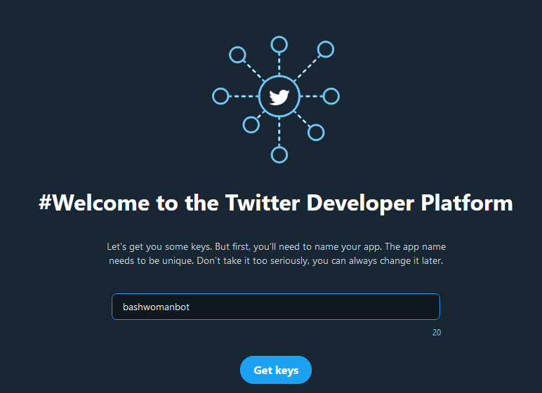 Here, I'm using my new account BashWoman to make a bot, which will like, and retweet the hashtag #python3.